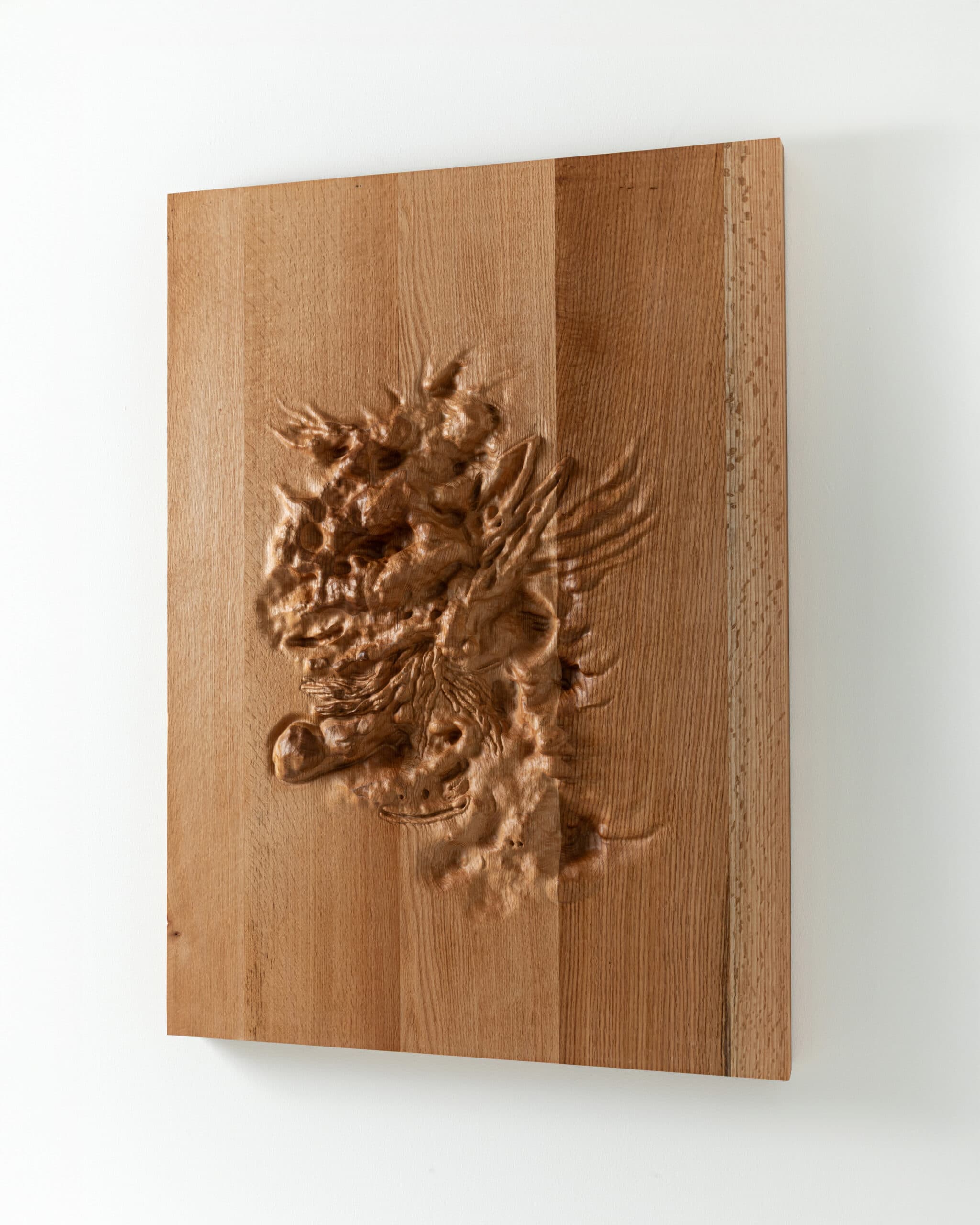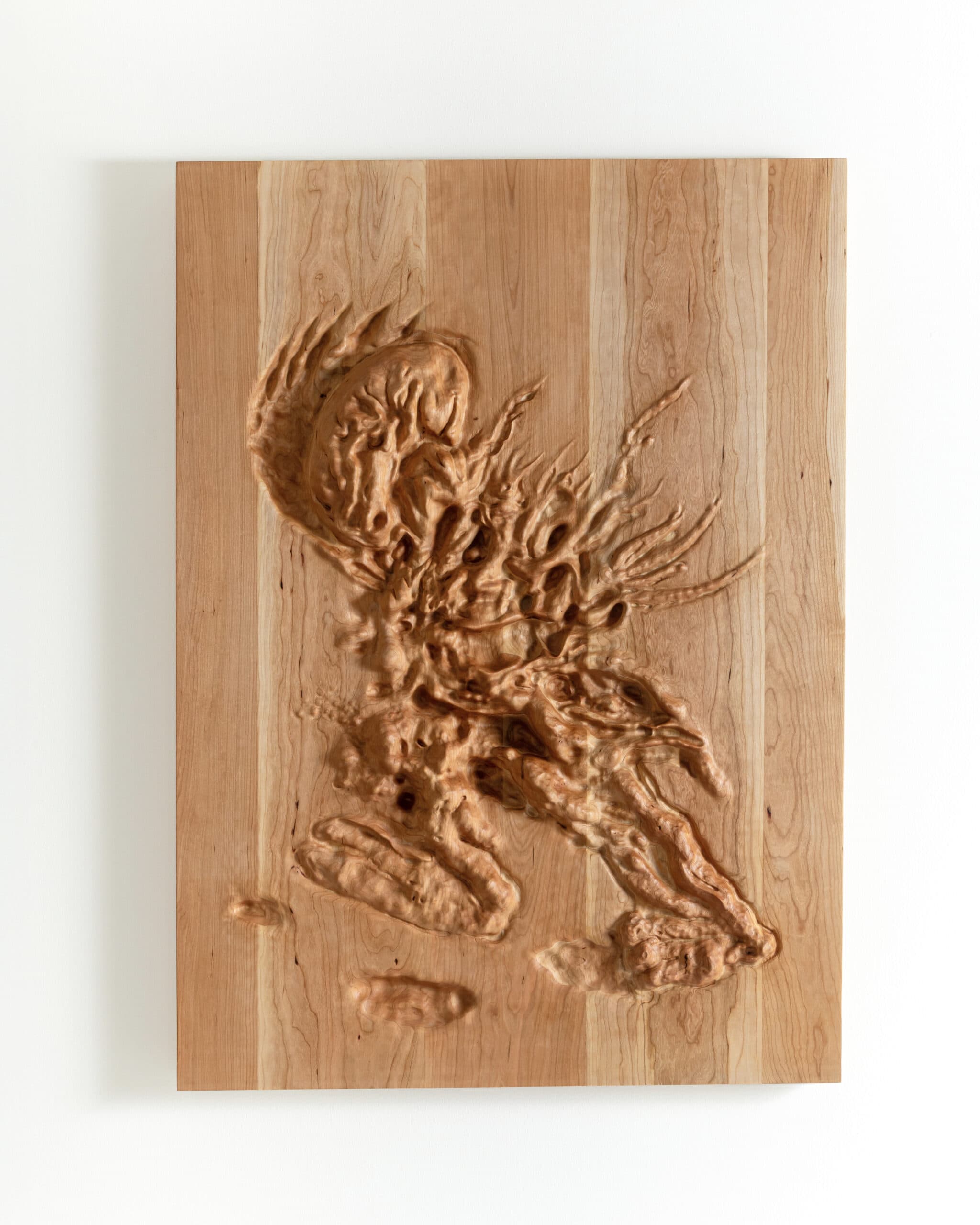 Brynjar explores new ways to create shapes and objects without using traditional design software. It mainly uses computer programs that are used to create avatars, which allows users to sculpt in a way that feels like working with soft clay. Through these experiments, Brynjar has developed a style he calls “Animated Geology.” He’s already made porcelain vases for Galerie Kreo in Paris using this method, and now he’s applying it to create relief murals in wood.