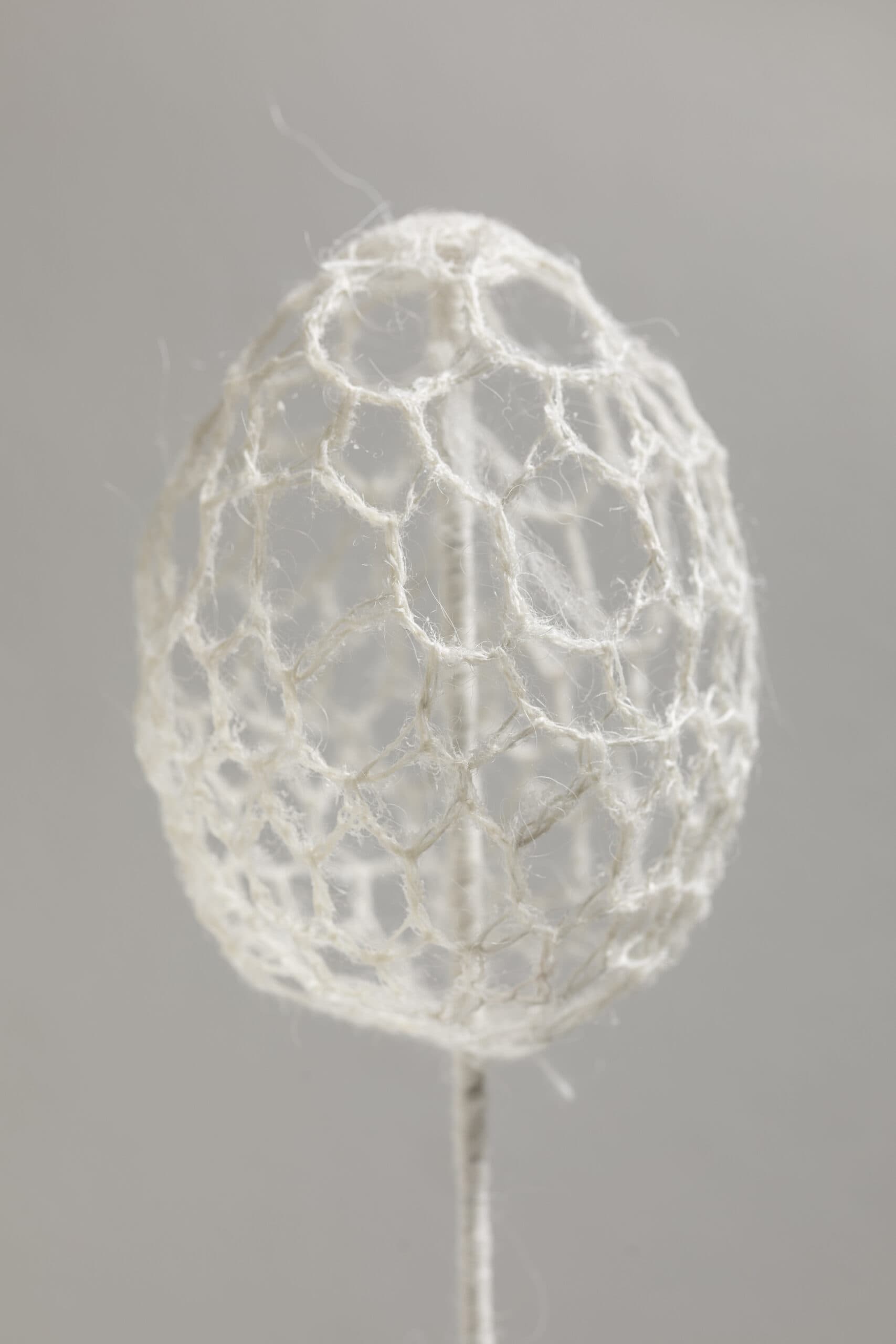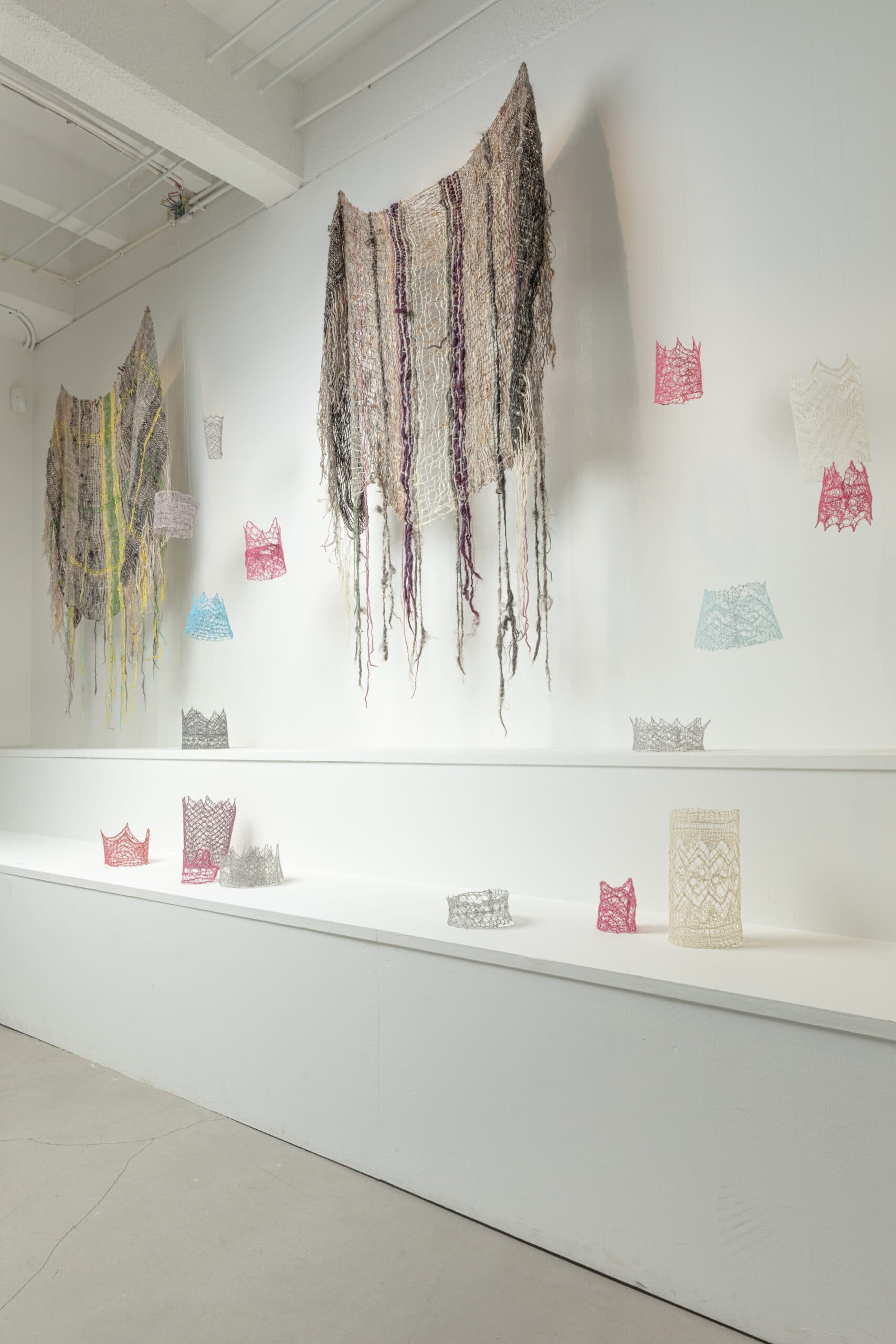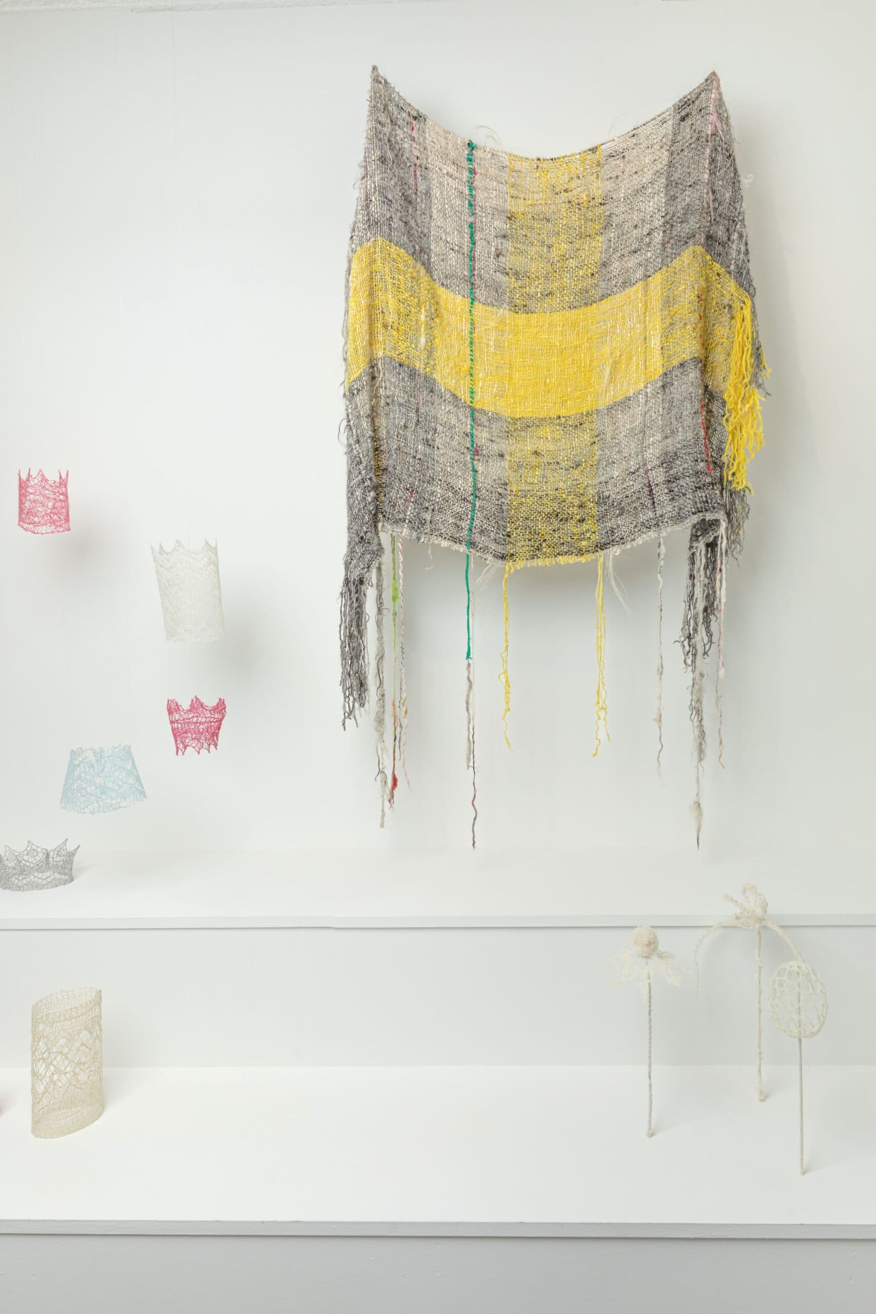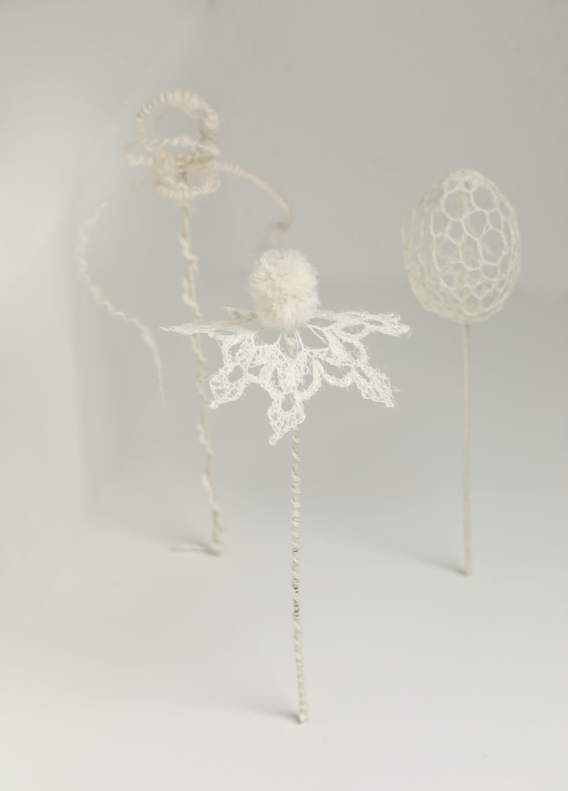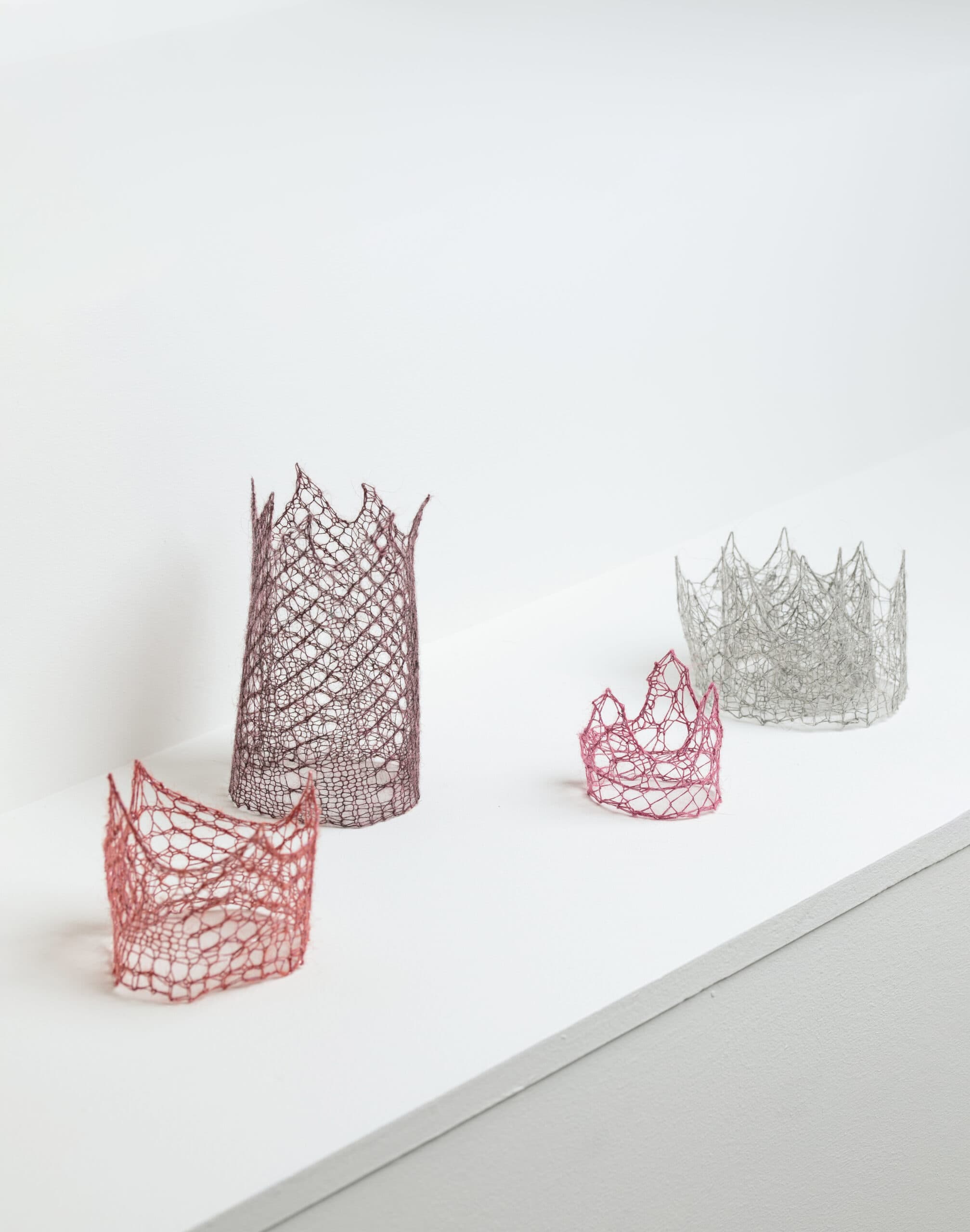 Judith Amalía is fascinated by the magical moment, the instant when a gateway opens from the everyday world into the realm of dreams and fairy tales. Tiaras and magic wands are traditional symbols of fairy tales. The core of her work is handspun wool, created through free flow and lace knitting, where each stitch is crafted according to a predetermined pattern. This creates tension between two opposites, the magical and the everyday.
